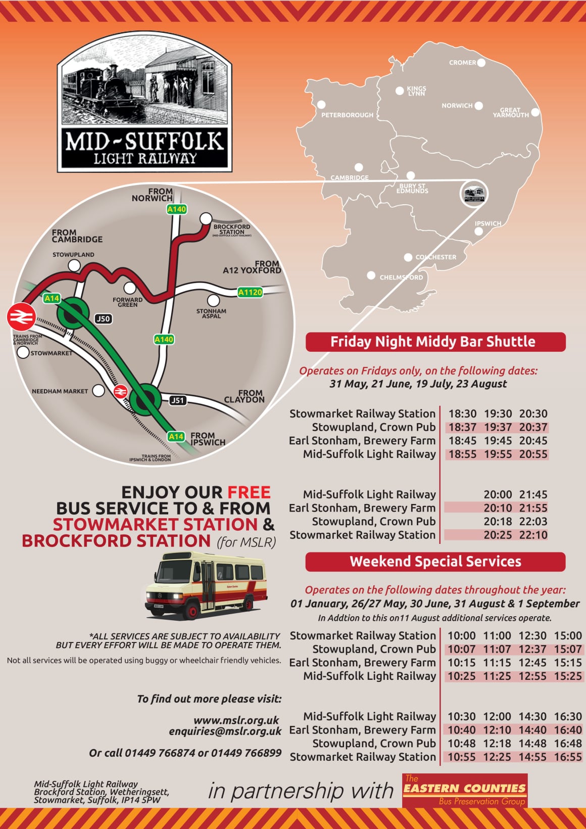 As part of our ever growing group, we have recently formed a partnership with the Mid-Suffolk Light Railway to offer a free bus service to & Stowmarket Railway Station on selective dates throughout 2024!
