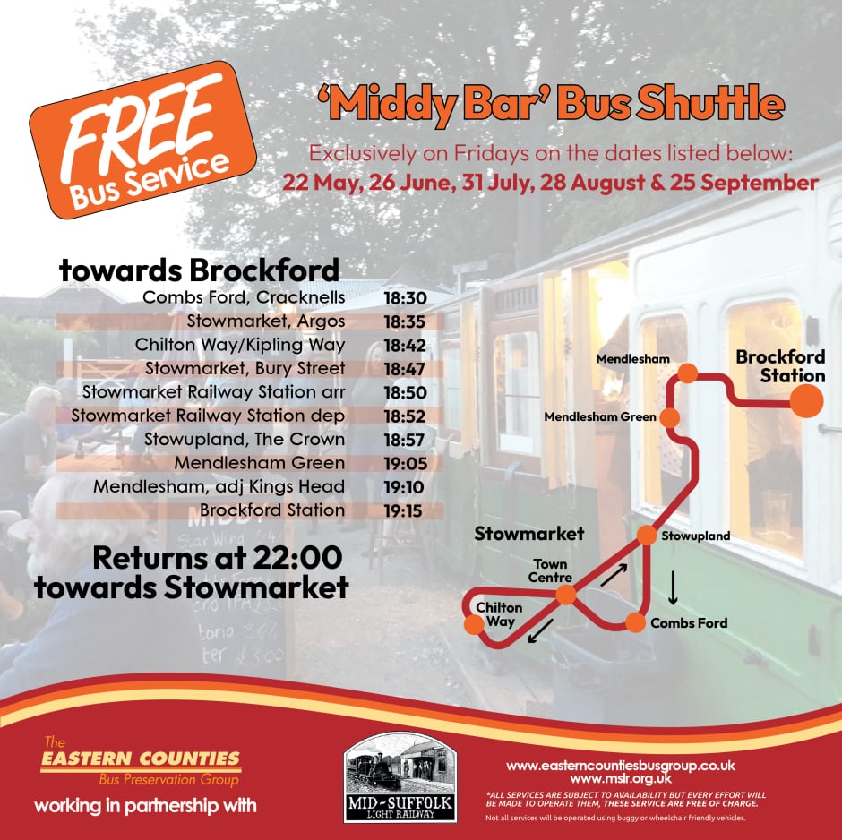 New for 2024 is a brand new partnership between us & The Mid-Suffolk Light Railway to offer free services to Brockford Station on selective dates from Stowmarket Railway Station including Friday Nights at The Middy Bar!